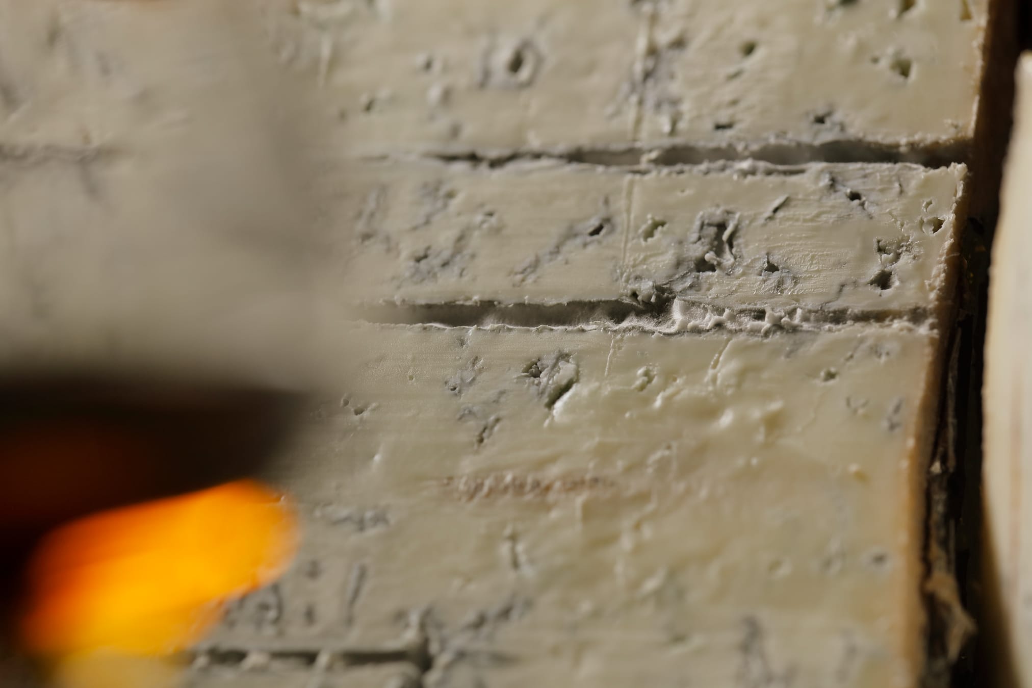 Aspect interne : pâte molle et crue, humide et compacte, légèrement friable, présente une distribution homogène de moisissures, a une couleur blanche ivoire et le fromage se présente principalement avec du bleu foncé et vert sauge et gris clair;